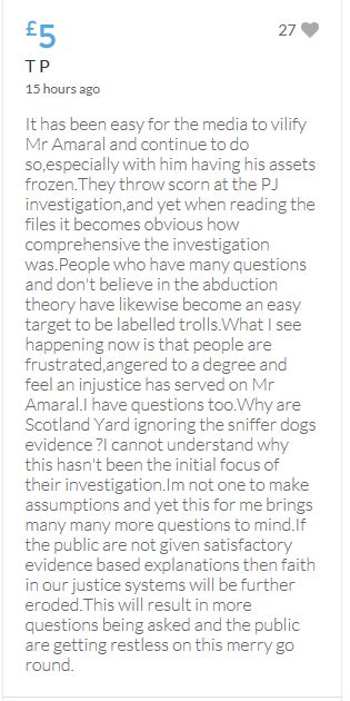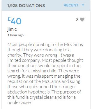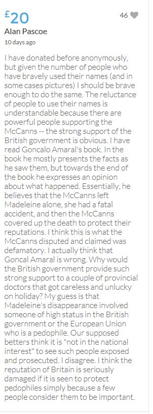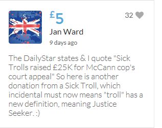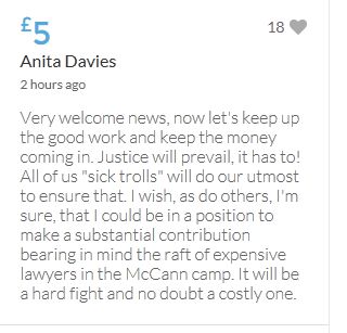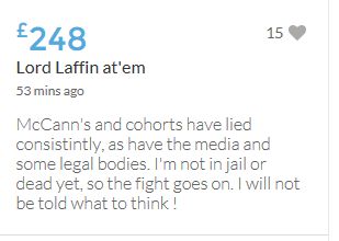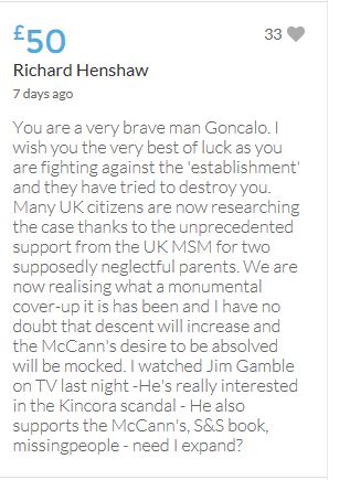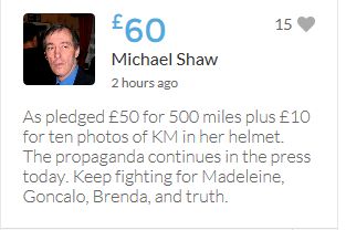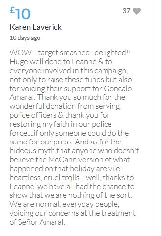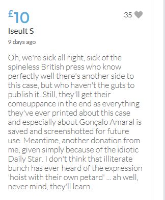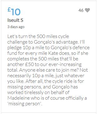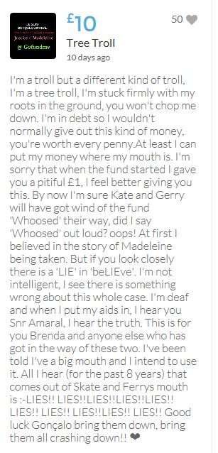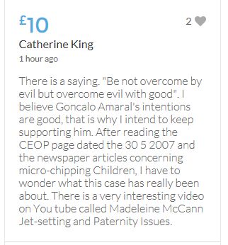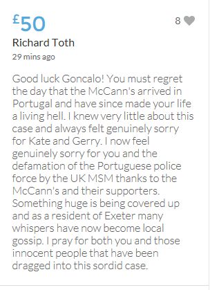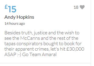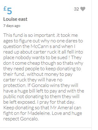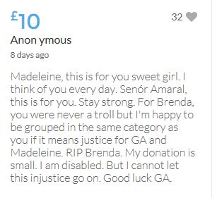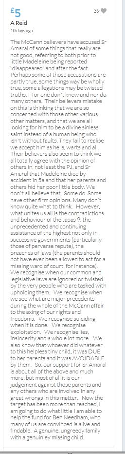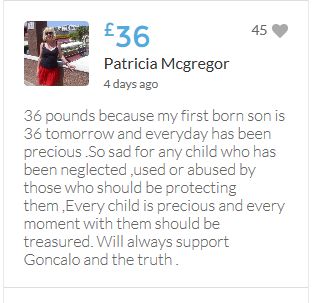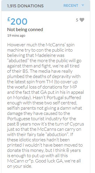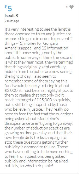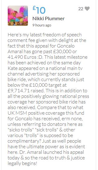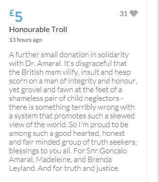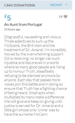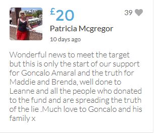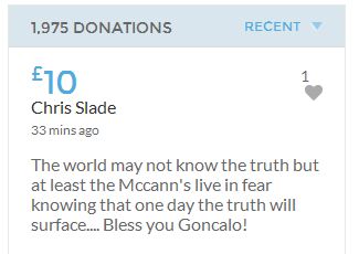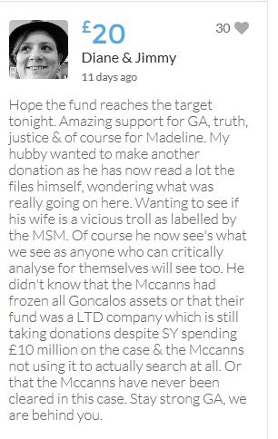 Hope the fund reaches the target tonight. Amazing support for GA, truth, justice & of course for Madeline. My hubby wanted to make another donation as he has now read a lot the files himself, wondering what was really going on here. Wanting to see if his wife is a vicious troll as labelled by the MSM. Of course he now see's what we see as anyone who can critically analyse for themselves will see too. He didn't know that the Mccanns had frozen all Goncalos assets or that their fund was a LTD company which is still taking donations despite SY spending £10 million on the case & the Mccanns not using it to actually search at all. Or that the Mccanns have never been cleared in this case. Stay strong GA, we are behind you.