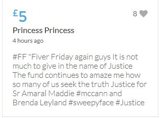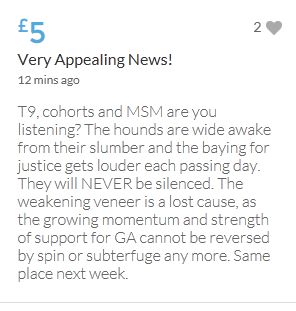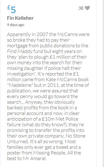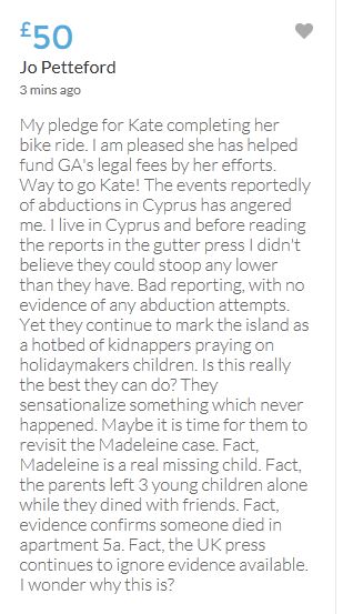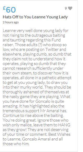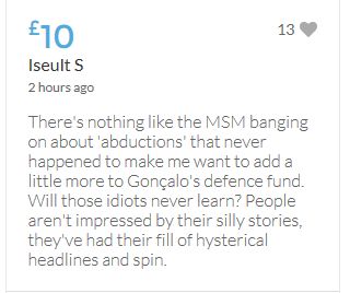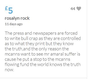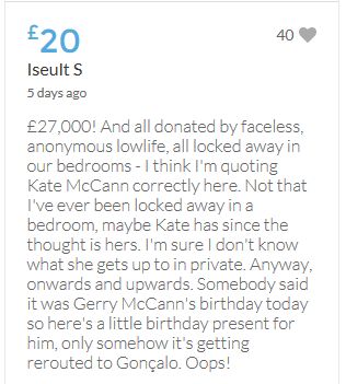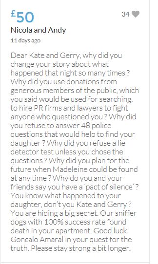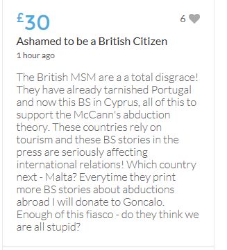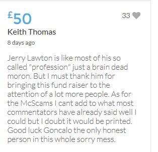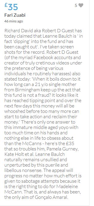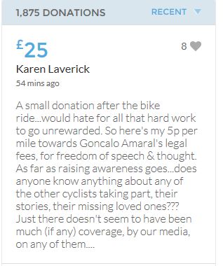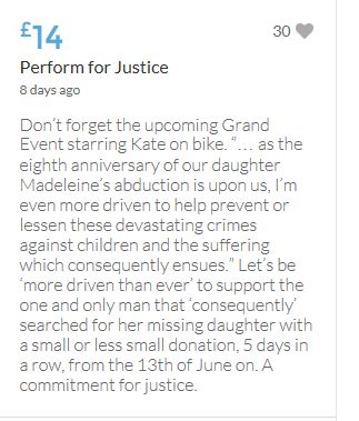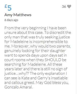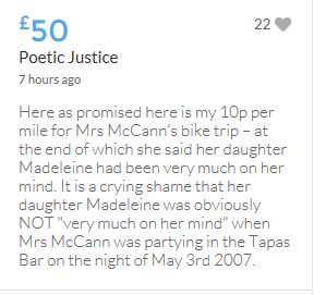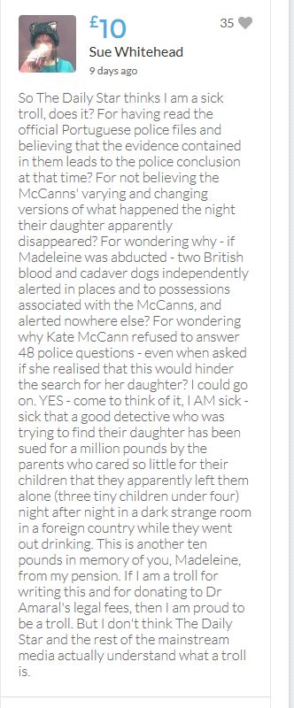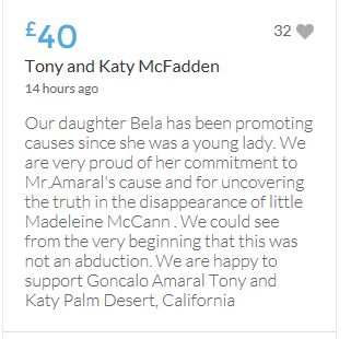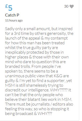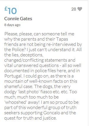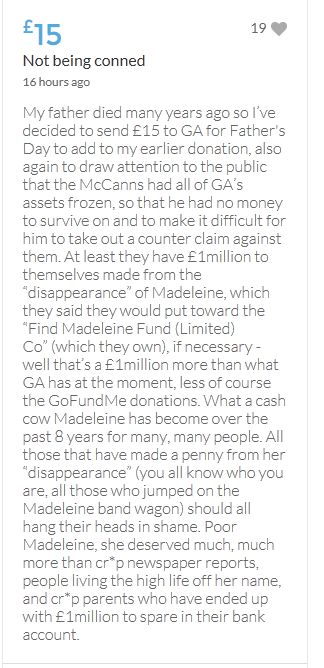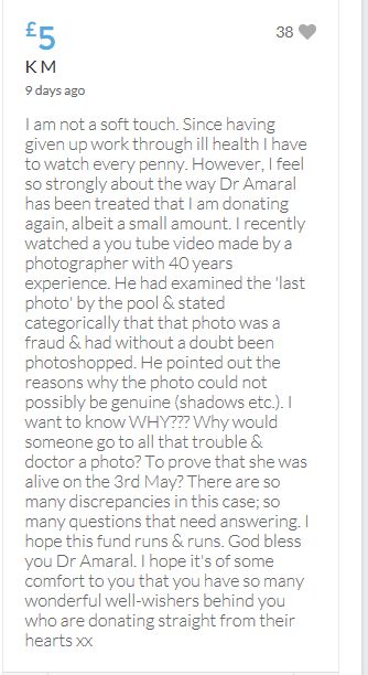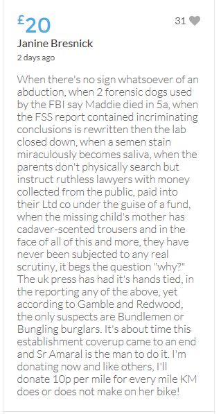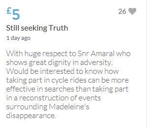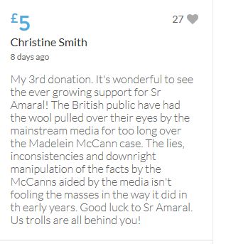 Hope the fund reaches the target tonight. Amazing support for GA, truth, justice & of course for Madeline. My hubby wanted to make another donation as he has now read a lot the files himself, wondering what was really going on here. Wanting to see if his wife is a vicious troll as labelled by the MSM. Of course he now see's what we see as anyone who can critically analyse for themselves will see too. He didn't know that the Mccanns had frozen all Goncalos assets or that their fund was a LTD company which is still taking donations despite SY spending £10 million on the case & the Mccanns not using it to actually search at all. Or that the Mccanns have never been cleared in this case. Stay strong GA, we are behind you.