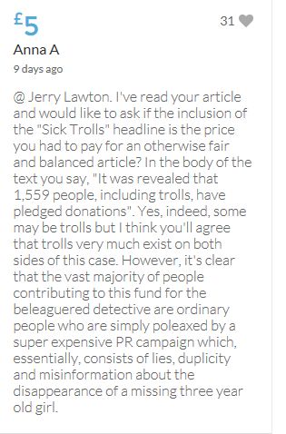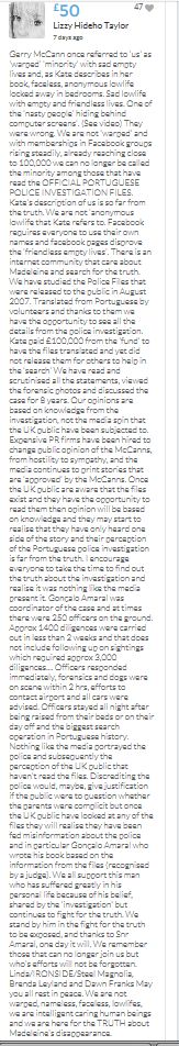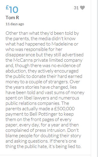 Other than what they'd been told by the parents, the media didn't know what had happened to Madeleine or who was responsible for her disappearance but they still advertised the McCanns private limited company and, though there was no evidence of abduction, they actively encouraged the public to donate their hard earned money to a couple of strangers. Over the years stories have changed, lies have been told and vast sums of money spent on libel lawyers and numerous public relations companies. The parents actually made a £500,000 payment to Bell Pottinger to keep them on the front pages of every paper, every day, for a year and then complained of press intrusion. Don't blame people for doubting their story and asking questions. If there's one thing the public hate, it's being lied to.