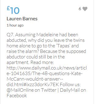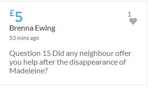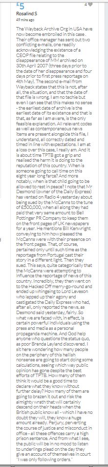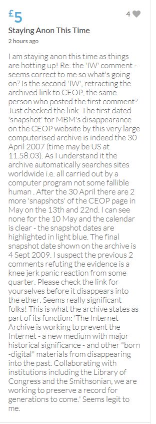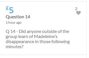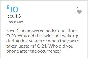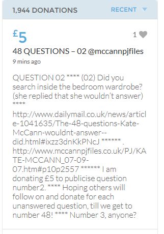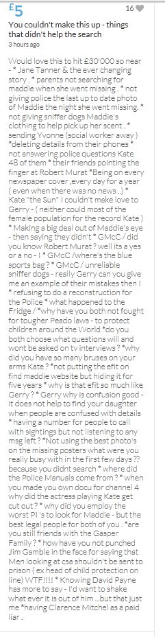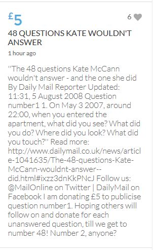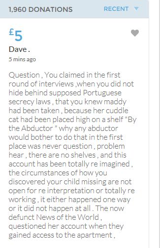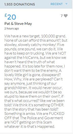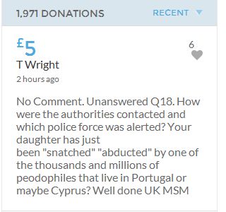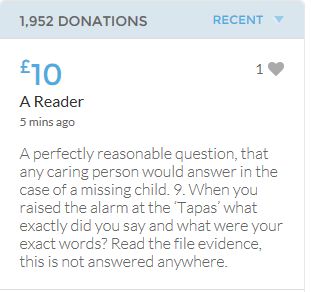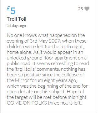 No one knows what happened on the evening of 3rd May 2007, when these children were left for the forth night, home alone. As it would appear in an unlocked ground floor apartment on a public road. It seems refreshing to read the 'troll tolls' comments, nothing has been so positive since the collapse of the Mirror forum eight years ago, which was the beginning of the end for open debate on this subject. Hopeful the target will be met before midnight. COME ON FOLKS three hours left.