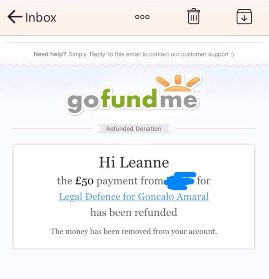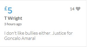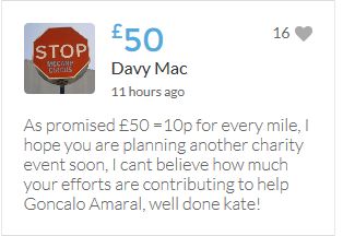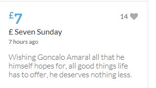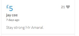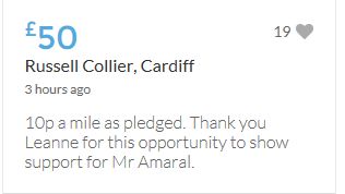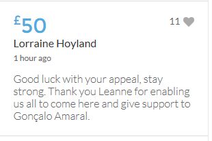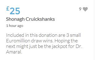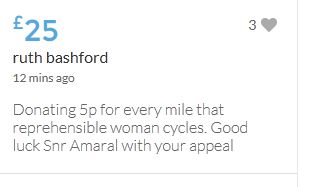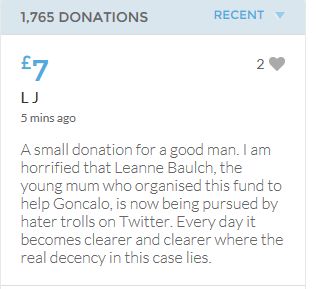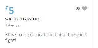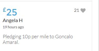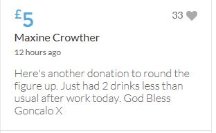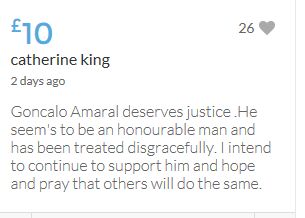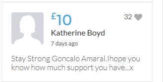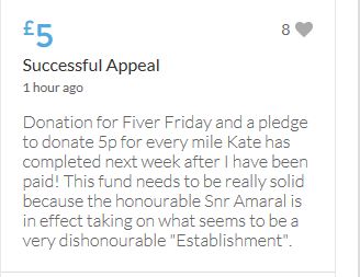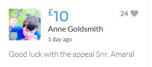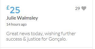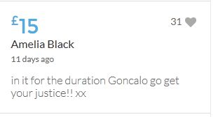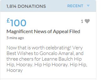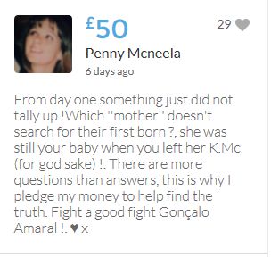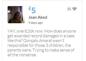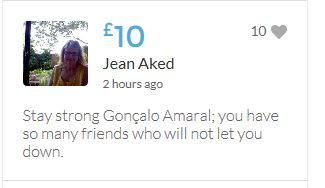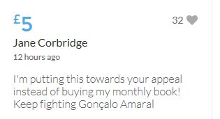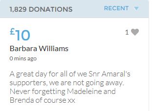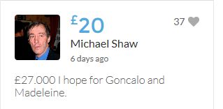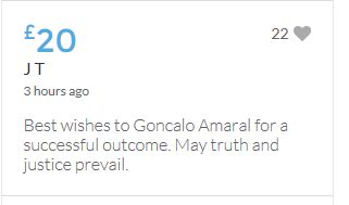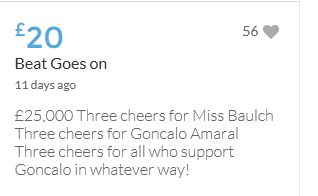 £25,000 Three cheers for Miss Baulch Three cheers for Goncalo Amaral Three cheers for all who support Goncalo in whatever way!