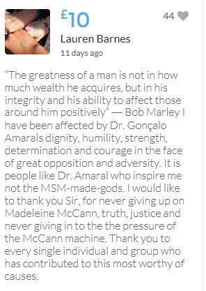 “The greatness of a man is not in how much wealth he acquires, but in his integrity and his ability to affect those around him positively”― Bob Marley I have been affected by Dr. Gonçalo Amarals dignity, humility, strength, determination and courage in the face of great opposition and adversity. It is people like Dr. Amaral who inspire me not the MSM-made-gods. I would like to thank you Sir, for never giving up on Madeleine McCann, truth, justice and never giving in to the the pressure of the McCann machine. Thank you to every single individual and group who has contributed to this most worthy of causes.