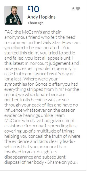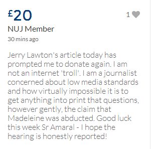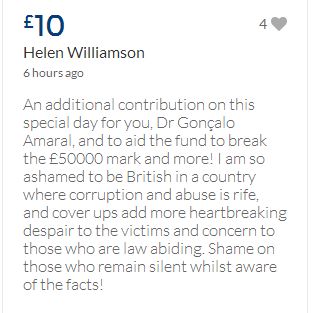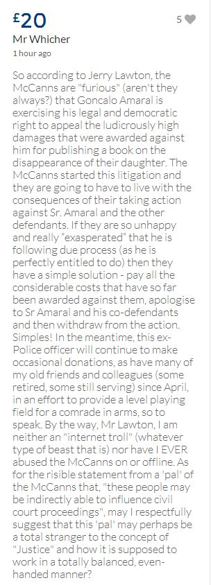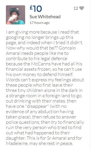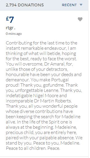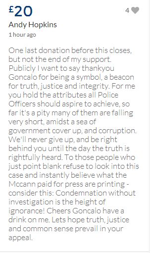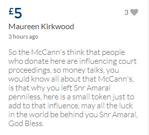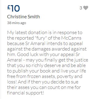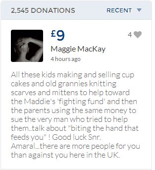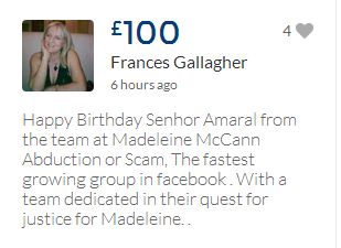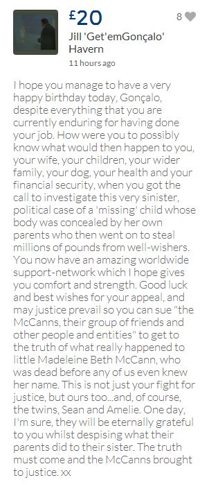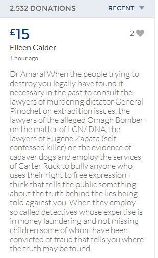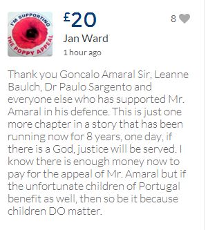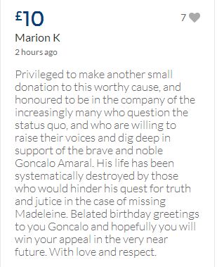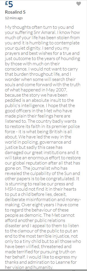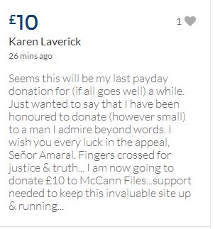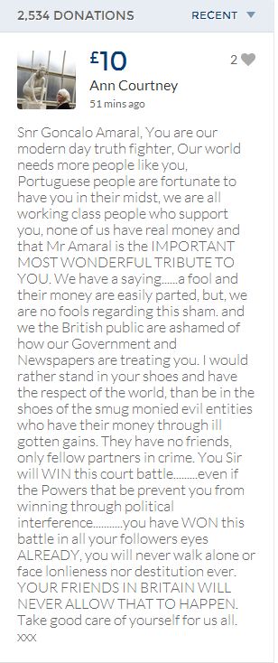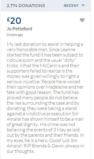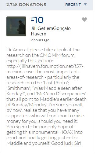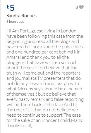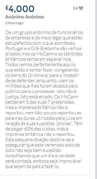 From a group of company workers and of the legal system who are stupefied with what has happened. Portugal and Great Britain are old allies, but the McCanns and the British tabloids have tried to separate us. We all see perfectly what they are trying to do, freezing Dr. Amaral's assets in order to keep him from defending himself, while they use the millions that were donated by the public to sue him. This is not justice. This is wrong. The McCanns lost 5 of their 7 claims, but the British press hasn't reported it, neither did they report the harsh words used by the judge in relation to their presumed "proof". They must pay 60% of the costs, but the British press has not reported it. This small donation is to ensure that this venomous act of hate will not succeed. We believe that one day the truth will be told, although it will be improbable that it will be the parents who will do it. |