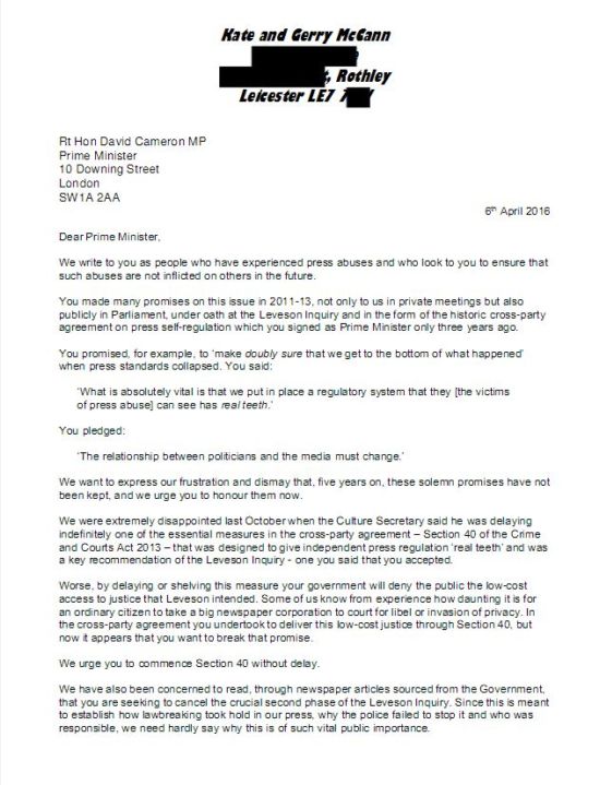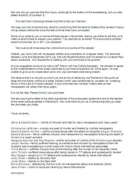 Letter from press victims to David Cameron