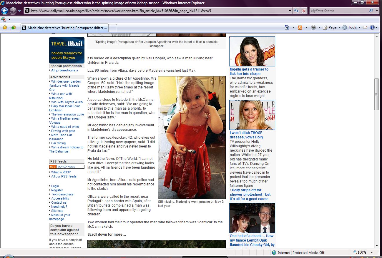 When shown a picture of Mr Agostinho, Mrs Cooper, 50, said: "He's the spitting image of the man I saw three times at the resort where Madeleine vanished."