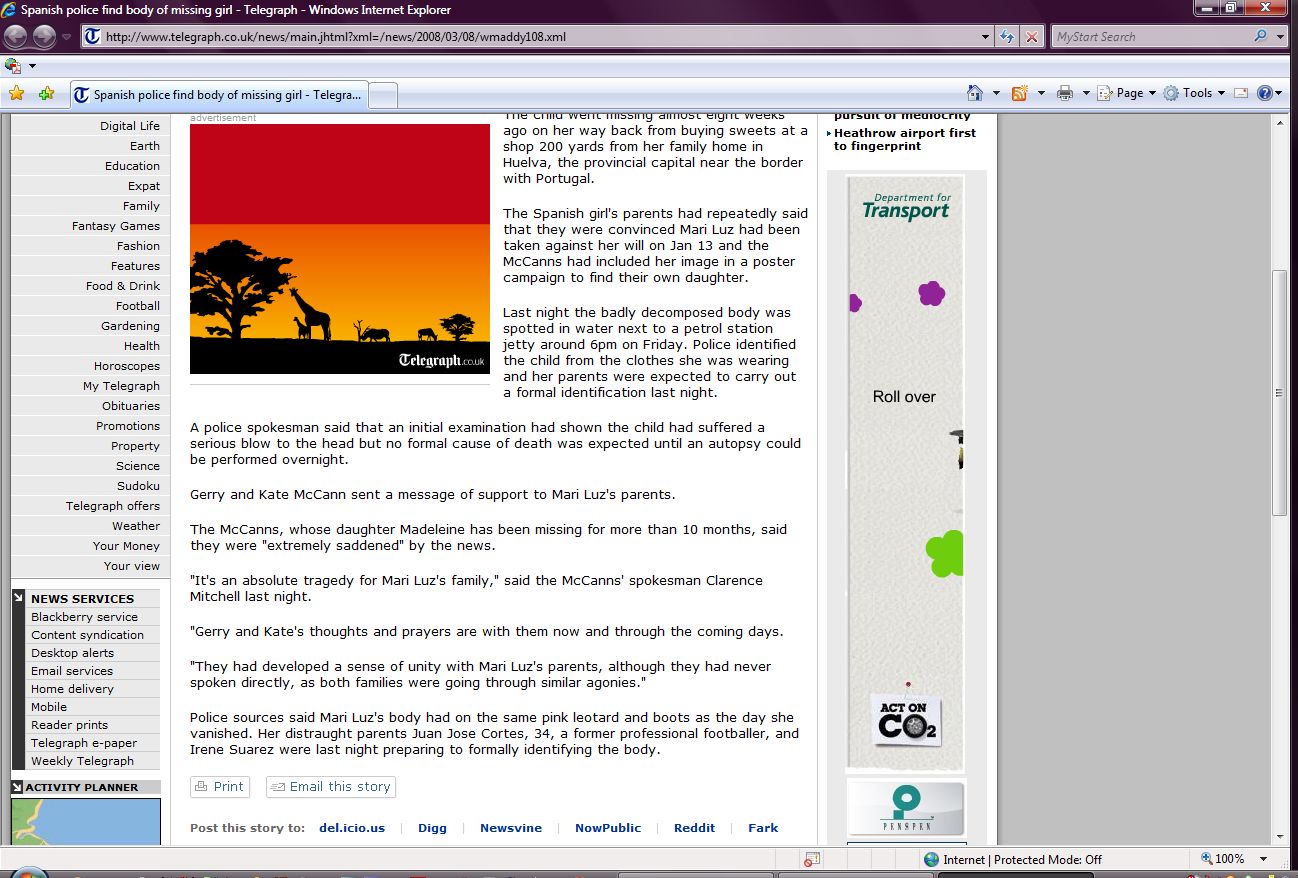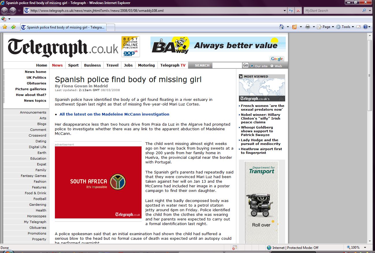 The Spanish girl's parents had repeatedly said that they were convinced Mari Luz had been taken against her will on Jan 13 and the McCanns had included her image in a poster campaign to find their own daughter.