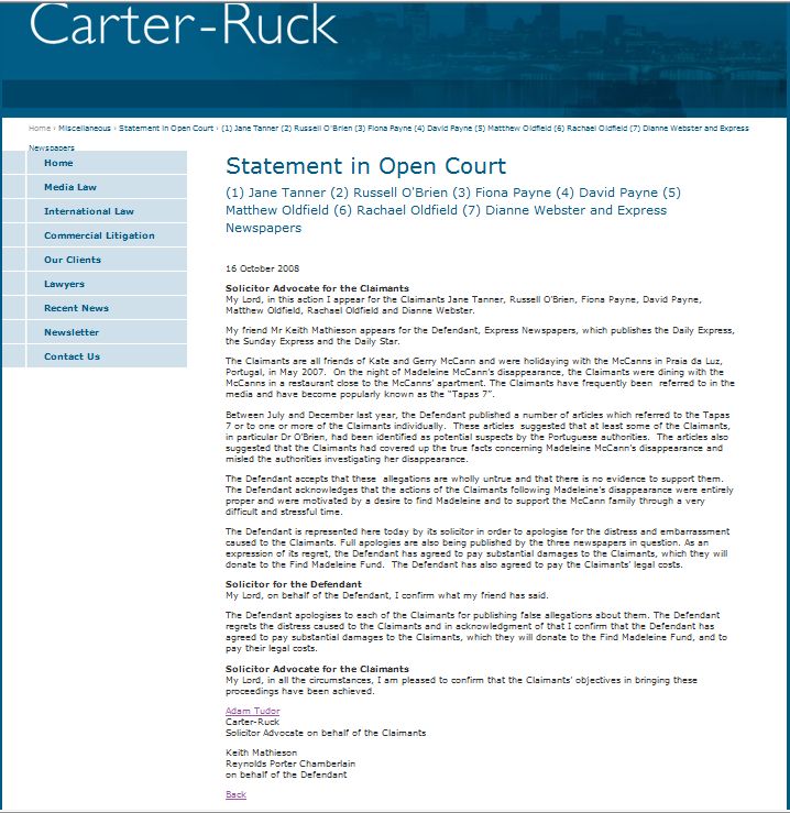 The Defendant accepts that these allegations are wholly untrue and that there is no evidence to support them. The Defendant acknowledges that the actions of the Claimants following Madeleine’s disappearance were entirely proper and were motivated by a desire to find Madeleine and to support the McCann family through a very difficult and stressful time.