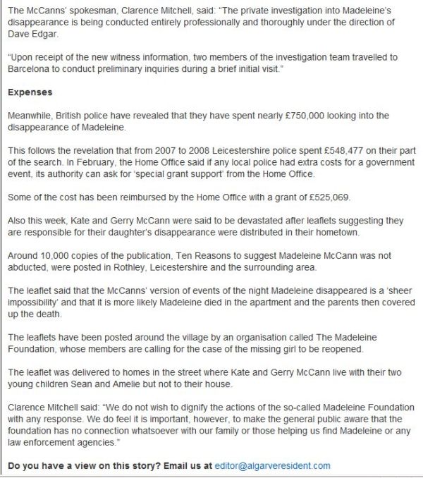 The McCanns’ spokesman, Clarence Mitchell, said: “The private