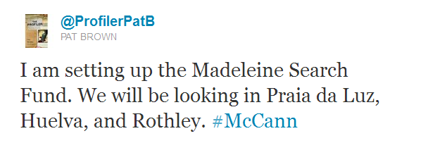 Pat Brown is going to set up a fund to search Madeleine McCann, on her
