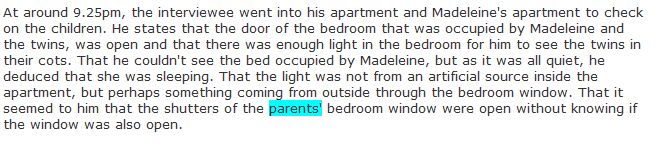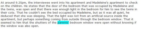 At around 9.25pm, the interviewee went into his apartment and Madeleine's apartment to check on the children. He states that the door of the bedroom that was occupied by Madeleine and the twins, was open and that there was enough light in the bedroom for him to see the twins in their cots. That he couldn't see the bed occupied by Madeleine, but as it was all quiet, he deduced that she was sleeping. That the light was not from an artificial source inside the apartment, but perhaps something coming from outside through the bedroom window. That it seemed to him that the shutters of the parents' bedroom window were open without knowing if the window was also open. http://www.mccannpjfiles.co.uk/PJ/MATTHEW-OLDFIELD.htm