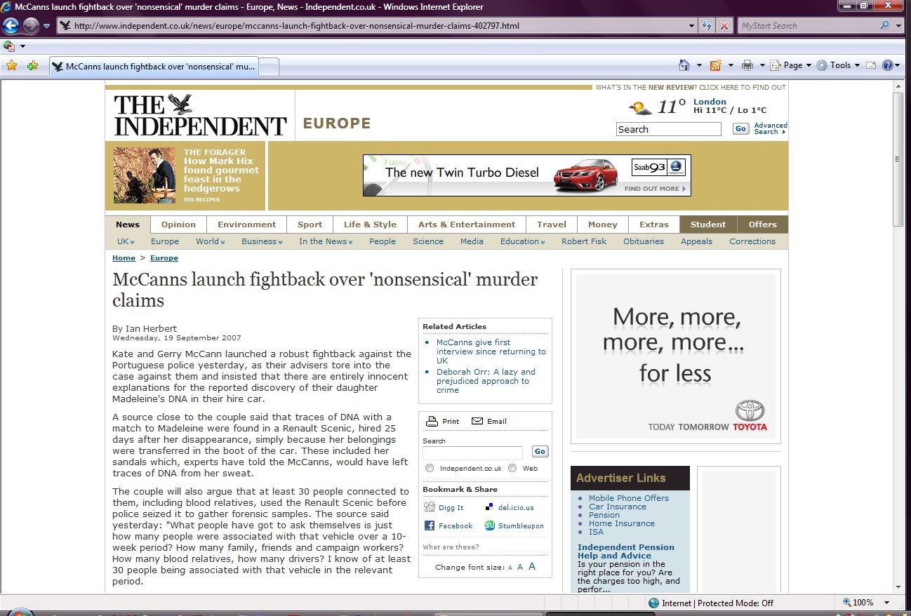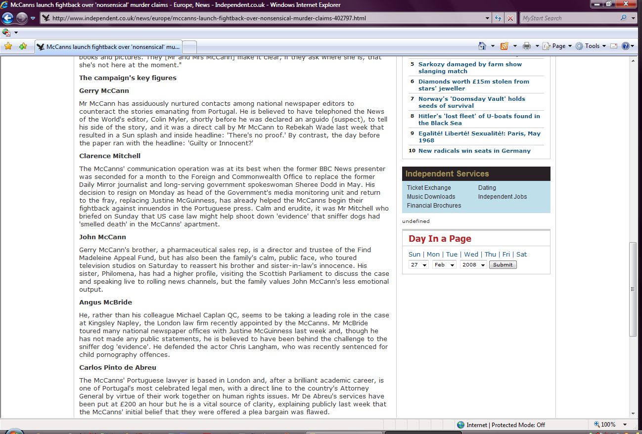 Mr McCann has assiduously nurtured contacts among national newspaper editors to counteract the stories emanating from Portugal. He is believed to have telephoned the News of the World's editor, Colin Myler, shortly before he was declared an arguido (suspect), to tell his side of the story, and it was a direct call by Mr McCann to Rebekah Wade last week that resulted in a Sun splash and inside headline: 'There's no proof.' By contrast, the day before the paper ran with the headline: 'Guilty or Innocent?'