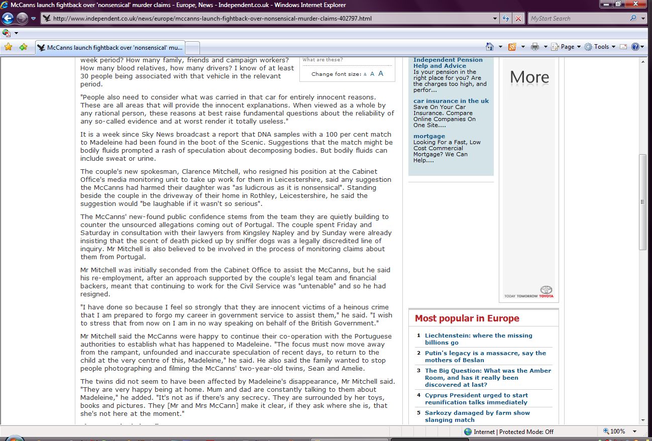 The McCanns' new-found public confidence stems from the team they are quietly building to counter the unsourced allegations coming out of Portugal. The couple spent Friday and Saturday in consultation with their lawyers from Kingsley Napley and by Sunday were already insisting that the scent of death picked up by sniffer dogs was a legally discredited line of inquiry. Mr Mitchell is also believed to be involved in the process of monitoring claims about them from Portugal.