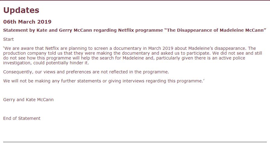 Statement by Kate and Gerry McCann regarding Netflix
